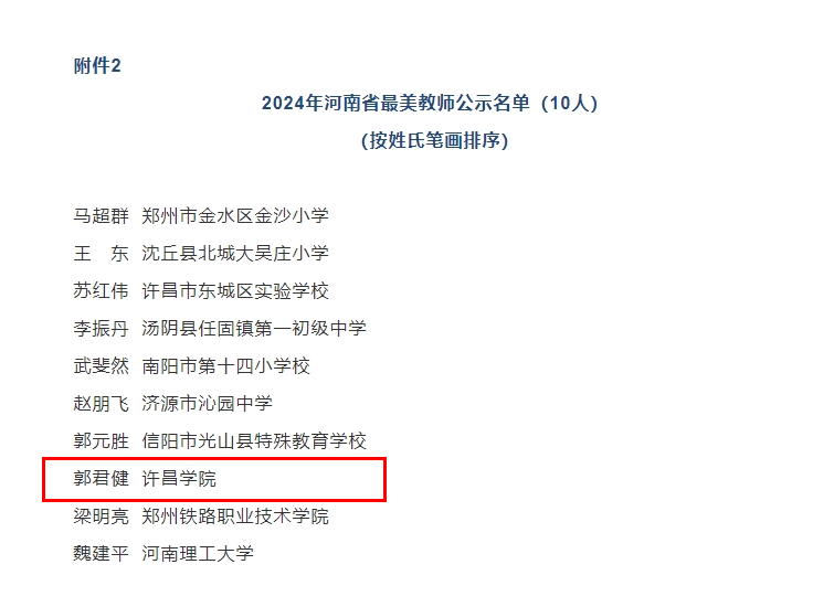 在第40个教师节来临之际,河南省教育厅公布了2024年河南省教书育人楷模、2024年河南省最美教师名单,经遴选推荐、资格审查、预选评审、专家终评、公示等环节,我校美术与设计学院郭君健教授当选2024年“河南省最美教师”。