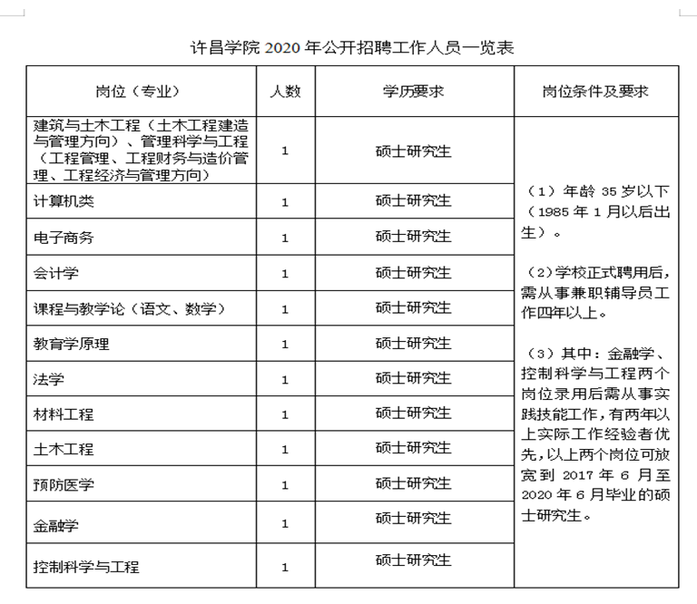 7.岗位所需的专业和其他条件(详见附件《许昌学院2020年公开招聘工作人员一览表》)。