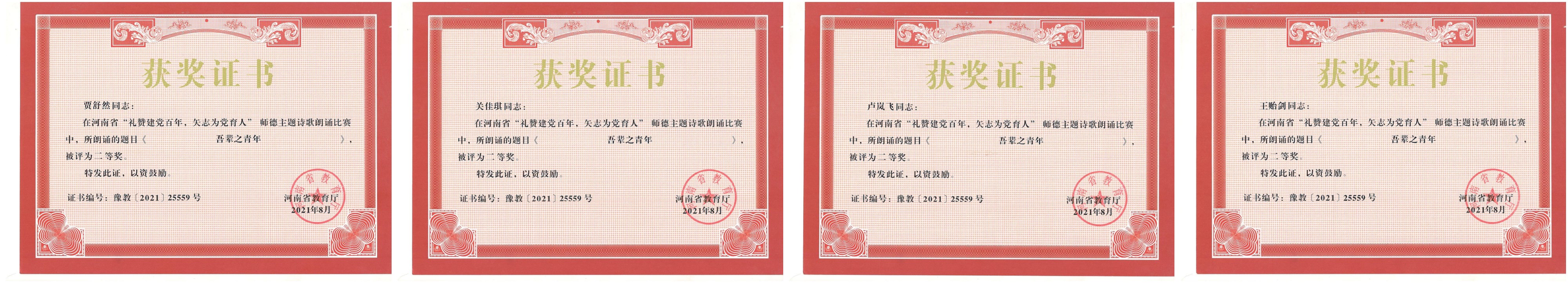 近日,河南省教育厅公布了“礼赞建党百年,矢志为党育人”诗歌朗诵比赛、师德教育主题征文和师德师风优秀案例评选结果。我校在诗歌朗诵比赛中获得二等奖,在师德主题征文评选中教师组获一等奖1项、二等奖2项、三等奖3项,师范生组获一等奖3项、二等奖3项、三等奖8项。