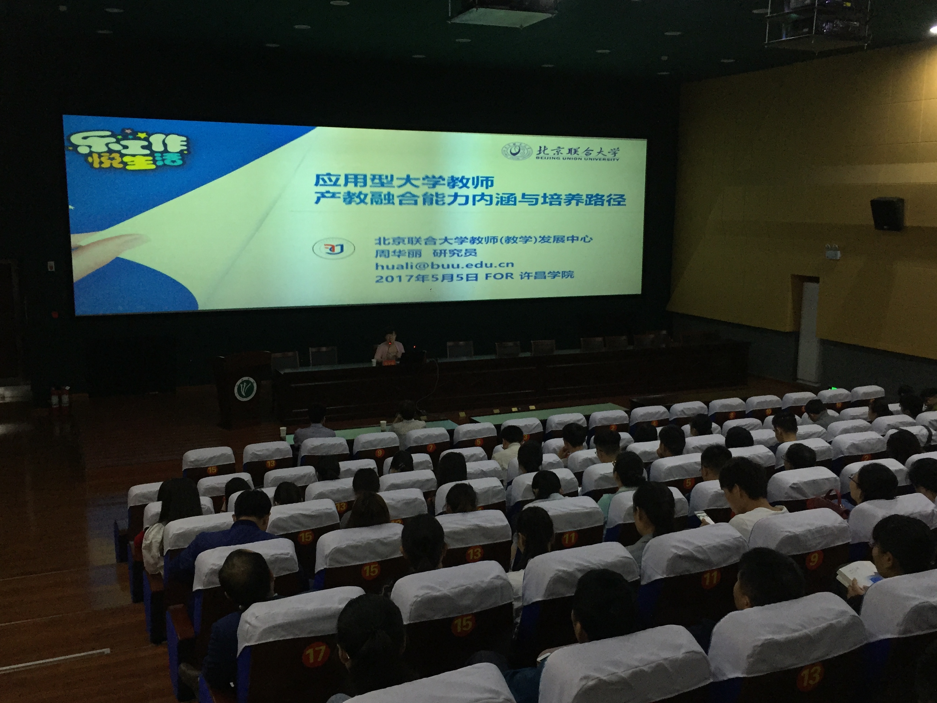 5月5日下午,我校邀请到教育部全国高校教师网络培训中心特聘专家、北京联合大学教师教学发展中心办公室主任、本科教学评估办公室负责人周华丽研究员,在创新创业学院双创信息中心,为全校博士教师代表和2016-2017年度新入职教师二百余人,做了题为《应用型大学教师产教融合能力内涵与培养路径》的专题报告。许昌学院院长赵继红、人事处长肖绍俊等领导到现场听取报告,报告由人事处副处长陈浩勇主持。