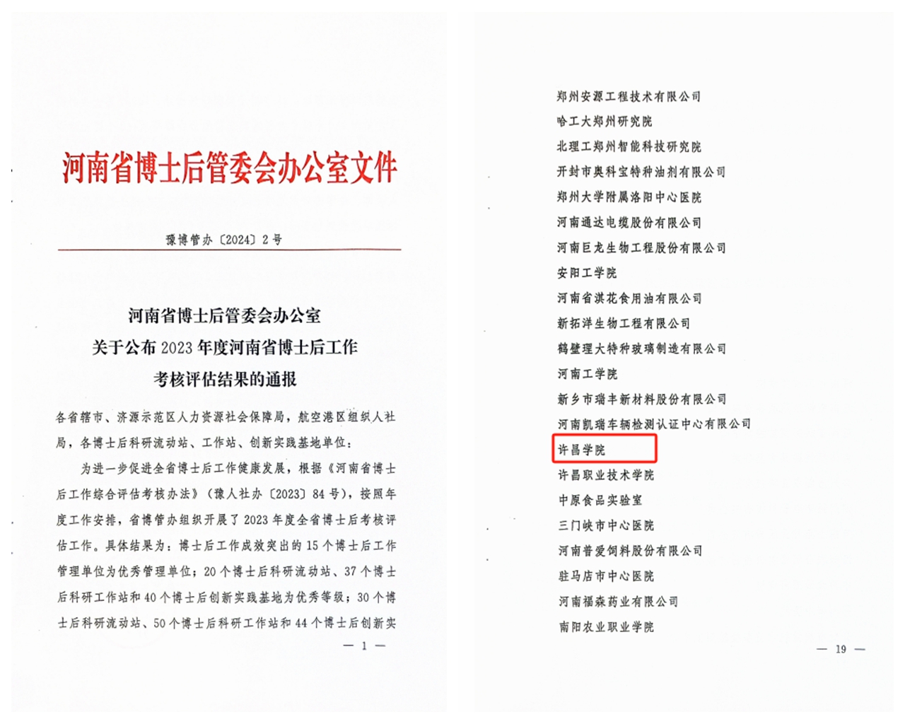 近日,河南省博士后管委会办公室印发了《关于公布2023年度河南省博士后工作考核评估结果的通报》(豫博管办〔2024〕2号)文件,公布了2023年度全省博士后工作考核评估结果,我校博士后创新实践基地被评为优秀等次。
