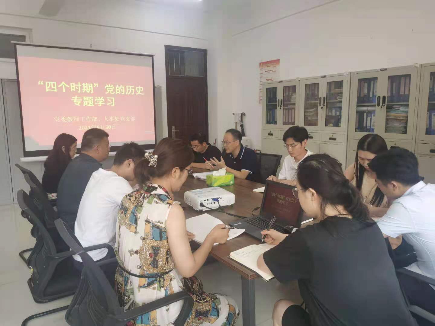 6月30日下午,党委教师工作部、人事处在行政楼430会议室召开“四个时期”党的历史专题学习讨论会。会议由党支部书记王俊主持,部门全体党员参加。